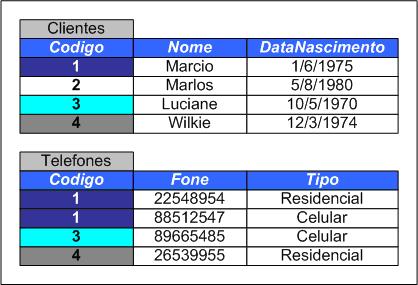 Note que o cliente Marcio possui dois telefones: um residencial e um celular. A cliente Luciane possui um telefone celular, Wilkie possui um residencial e Marlos não possui telefone.