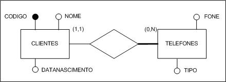 Costumamos representar um modelo conceitual através da abordagem entidade–relacionamento (ER). Nesta abordagem construimos um diagrama, chamado diagrama entidade-relacionamento. Observe abaixo o diagrama que originou as tabelas Clientes e Telefones: