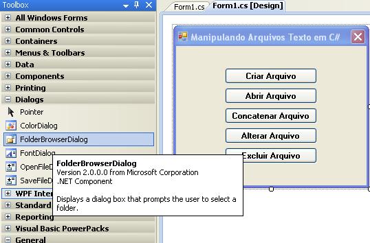 Vamos começar trabalhando com o componente FolderBrowserDialog, que nada mais do que uma janela de diálogo onde podemos trabalhar com pastas.