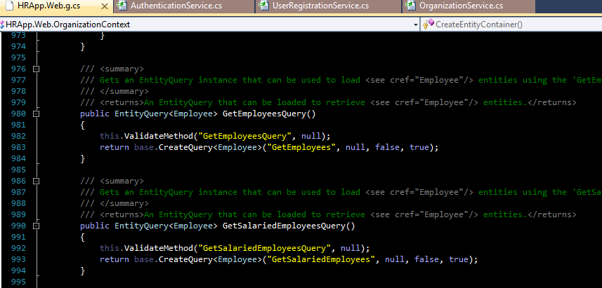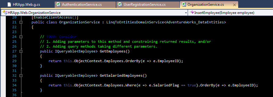 Entendendo melhor o processo, é que quando você compila o projeto, é feita uma cópia para o projeto silverlight, do seu Domain Service, ou seja, automaticamente o mesmo é espelhado no Domaind Context. Que contém absolutamente tudo, que existe no Domain Service, operações e entidades. Olhe um trecho do código do Domain Service e do Domain Context.