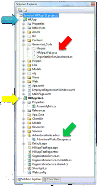 Seta Vermelha: Indica o arquivo que é gerado automaticcamente, pelo WCF RIA Services. Este arquivo, é gerado da exportação das funcionalidades do EDMX, que é o modelo de dados e as funcionalidades que podem ser adicionadas. Ou seja ele é o resultado da exportação do Domain Service, uma vez sendo compilada a solução se você abrir a pasta GeneratedCode destro da mesma, estará um arquivo deste( extensão .g.cs ).