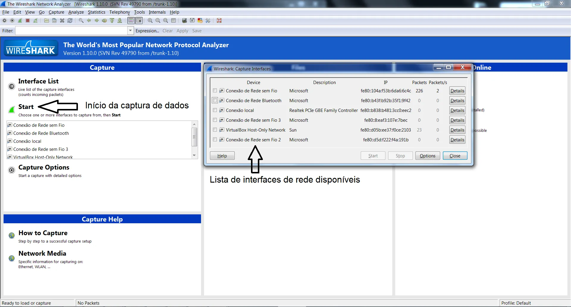 Figura 1. Lista de interfaces e início da captura de tráfego no Wireshark.