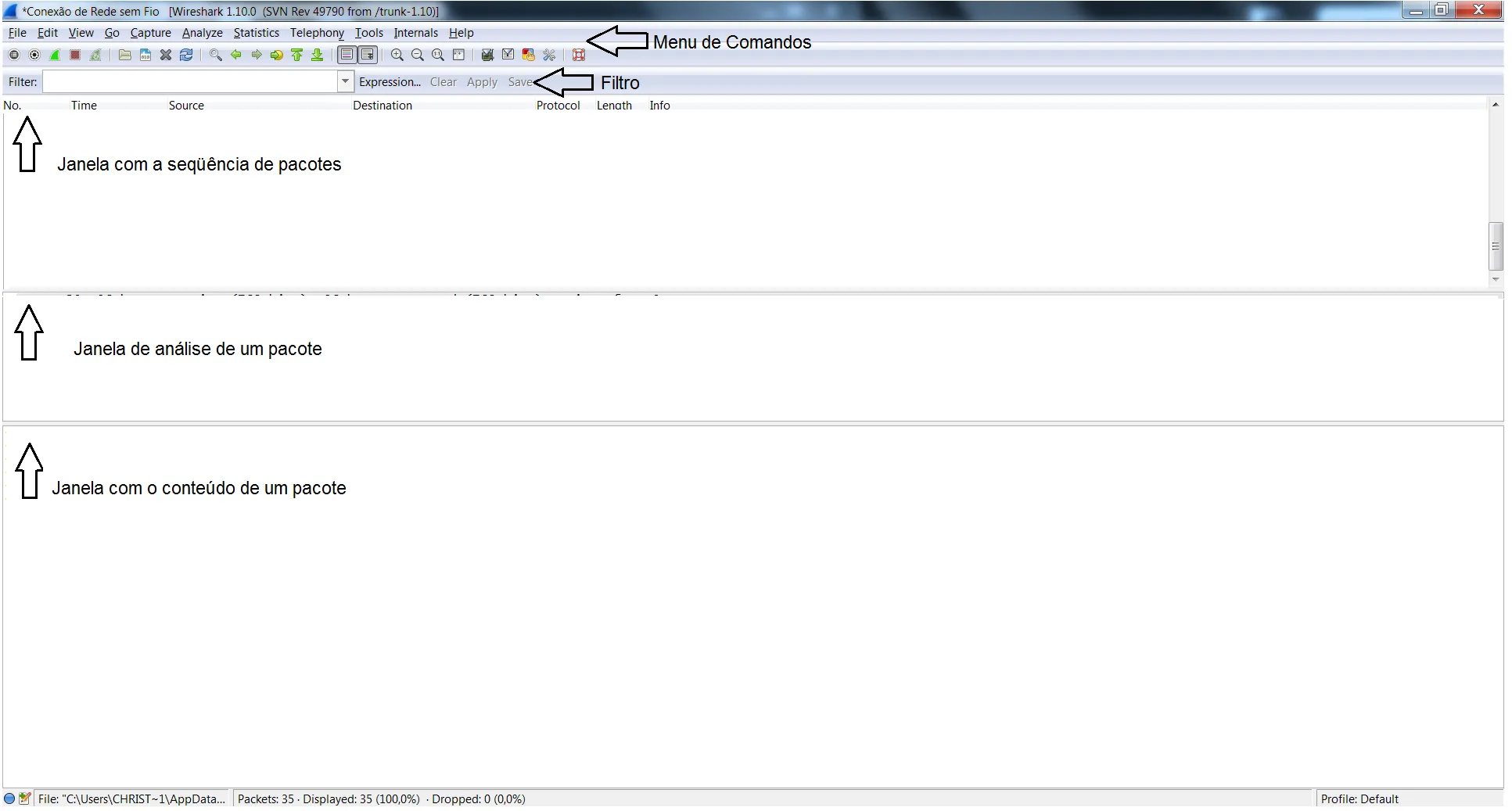 Ao iniciar a ferramenta, de maneira geral, podem-se verificar no Wireshark cinco partes principais, como mostra a Figura 2 e descritos a seguir: