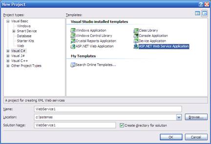No campo Name digite um nome para seu projeto como, por exemplo, WebService1. Escolha uma pasta para que o projeto seja criado, no nosso caso, será usada a pasta c:\sistemas. O Visual Studio criará uma pasta com o nome do projeto com toda a estrutura necessária automaticamente.